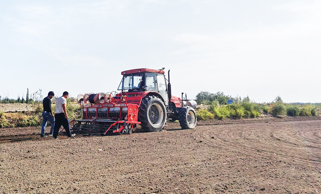 日前,在库尔勒市包头湖农场一处农田,农户正在进行冬小麦播种作业。(通讯员 孜拉拉·阿不力孜 摄)
