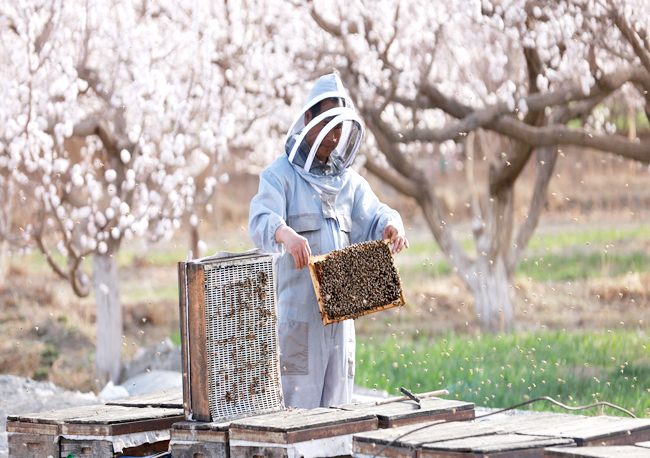 3月27日,在轮台县阳霞镇白杏种植基地,中国农业科学院蜜蜂研究所专家现场演示蜜蜂授粉操作要点。(特约记者 吐尔逊·吾斯曼 摄)