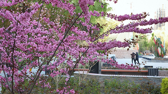 清明假期,库尔勒市人民广场春意盎然,色彩斑斓。粉红的榆叶梅热烈绽放,粉色的紫叶李娇艳动人,淡紫的丁香花清香四溢,翠绿的垂柳随风摇曳。各色花木相映成趣,勾勒出一幅生机盎然的春日画卷,吸引市民踏青赏景,尽享梨城美好春光。(记者 薛兵 摄)