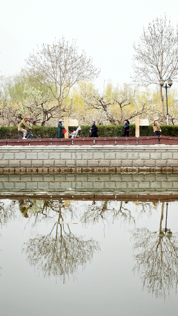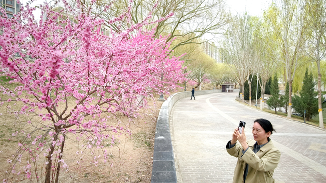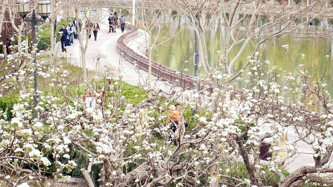 4月2日,库尔勒市天鹅河畔春意盎然,梨花洁白如雪、榆叶梅粉艳夺目,两花竞相开放、相映成景。不少市民前来踏青赏花,尽享大好春光。(记者 薛兵 摄)