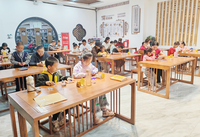 节日期间,家长和孩子在巴州图书馆参加“四季童读”秋季卷童书推荐活动,并参与手工制作。(记者 赵爽 摄)
