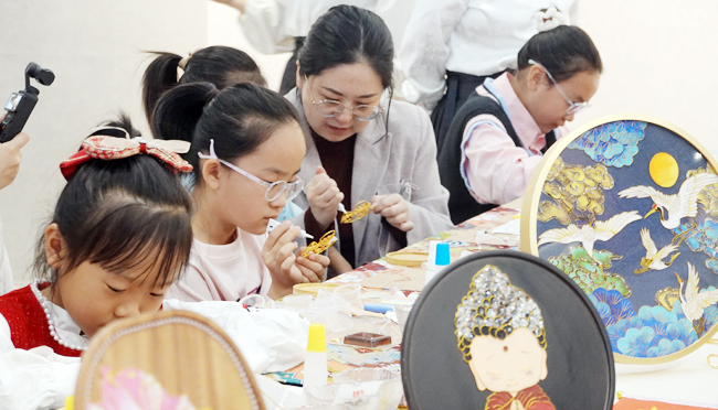 桌台上,各色铜丝被弯成玉兔、桂花、月亮等中秋元素,五彩斑斓的彩砂填充出层次分明的图案。原本普通的底板,在亲子协作下渐渐变得精致起来。“这次和爸爸一起做掐丝珐琅作品,不仅学会了手艺,还深入了解了中秋习俗,特别有意义。”9岁的李威廉说。