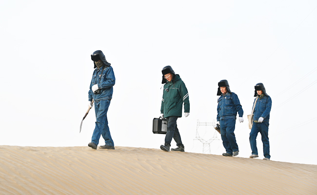 我们跟随队员们行进才半个小时,脸和手便冻得通红,沙粒直往脸上扑、往嘴和耳朵里灌。而这些线路巡检队员,每天都要在风沙中来回徒步十几公里,逐一排查、处置隐患,确保每基铁塔、每段导线都处于安全运行状态。