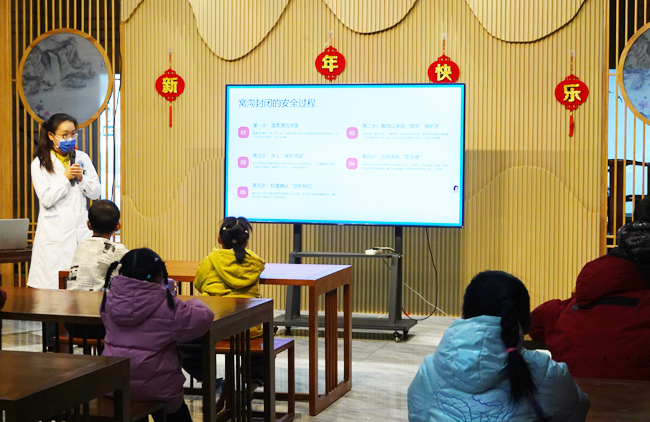 2月1日,在巴州图书馆,巴州第二人民医院牙科医生在向孩子们讲解口腔知识。(记者 赵爽 摄)