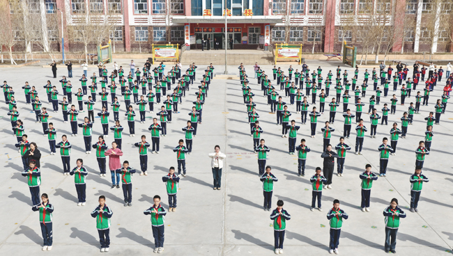 近日,若羌县城西新区学校的学生们在做特色武术课间操。(通讯员 王中信 摄)