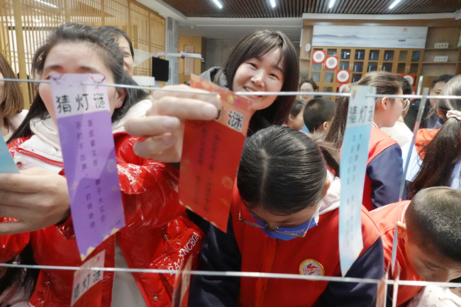 灯谜区前,小朋友们在解谜中比拼智慧。(记者 赵爽 摄)