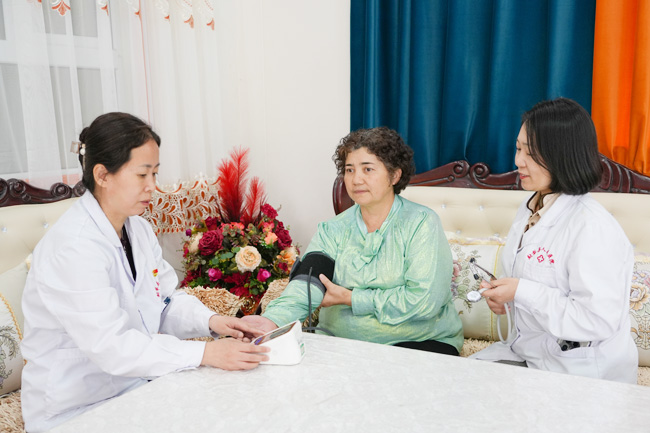 4月17日,河北省第十批医疗援疆团专家在尉犁县墩阔坦乡墩阔坦村开展巡诊义诊活动,免费为村民提供疾病诊查、健康咨询和测量血压、血糖等,为村民送去健康关爱。图为医疗援疆团专家为村民测量血压,细致讲解疾病防治、慢病管理、康复护理等健康科普知识。(通讯员 汪志鹏 摄)