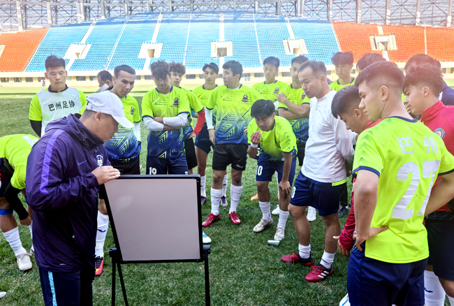 巴州足球队主教练为球员布置战术。(图片由巴州足球队教练组提供)