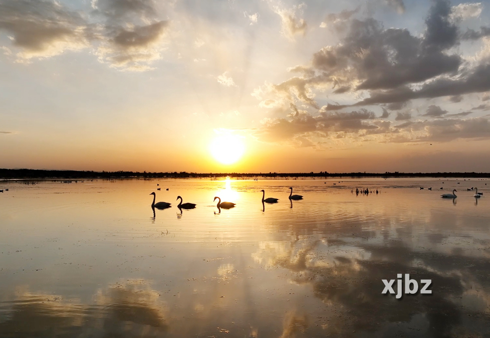 10月14日,辽阔的博斯腾湖波光粼粼,夕阳如金盘悬挂于天际,将天空与水面晕染成暖橙色调,成群结队的天鹅在湖面游弋。