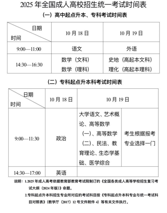 根据教育部统一安排,2025年成人高校招生全国统一考试(简称成人高考)将于2025年10月18日至19日举行。招生类型分高中起点升本科(以下简称高起本)、高中起点升专科(以下简称高起专)和专科起点升本科(以下简称专升本)三种。在校学习形式分脱产、非脱产两种,脱产最短学习时间为:高起本四年、高起专和专升本两年,非脱产最短学习时间为:高起本五年、高起专和专升本两年半。