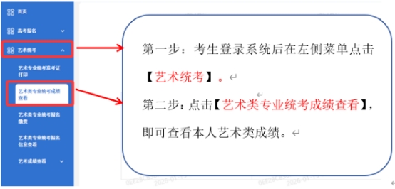 新疆2026年普通高等学校招生音乐类、舞蹈类、表(导)演类(戏剧影视导演方向、戏剧影视表演方向)、播音与主持类、美术与设计类、书法类专业统一考试成绩及各科类专业统考合格分数线将于2026年1月26日17时公布。