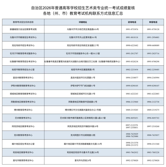 成绩复核程序:成绩复核工作由新疆教育考试院统筹实施。各地(州、市)教育考试机构具体负责属地考生成绩复核工作(按照复核流程相关要求,新疆教育考试院不直接接受考生个人复核申请)。申请成绩复核的考生自行下载并填写《自治区2026年普通高等学校招生艺术类专业统一考试成绩复核申请表》(附件1),于1月27日至29日向生源所在地(州、市)教育考试机构提出成绩复核书面申请,逾期不再受理。复核结果由各地(州、市)教育考试机构向考生反馈。