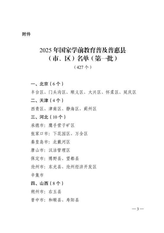 近日,教育部印发通知,公布2025年国家学前教育普及普惠县(市、区)名单。2025年第一批认定427个县(市、区)为国家学前教育普及普惠县。其中,天津、上海两个直辖市全域通过国家评估认定;内蒙古乌海市,江苏省无锡市、镇江市,浙江省杭州市、嘉兴市、金华市、丽水市、舟山市,山东省滨州市,海南省三沙市,四川省宜宾市,贵州省铜仁市,甘肃省嘉峪关市,新疆维吾尔自治区克拉玛依市、昌吉回族自治州、哈密市等16个市(州)全域通过国家评估认定。具体名单,一起来看——