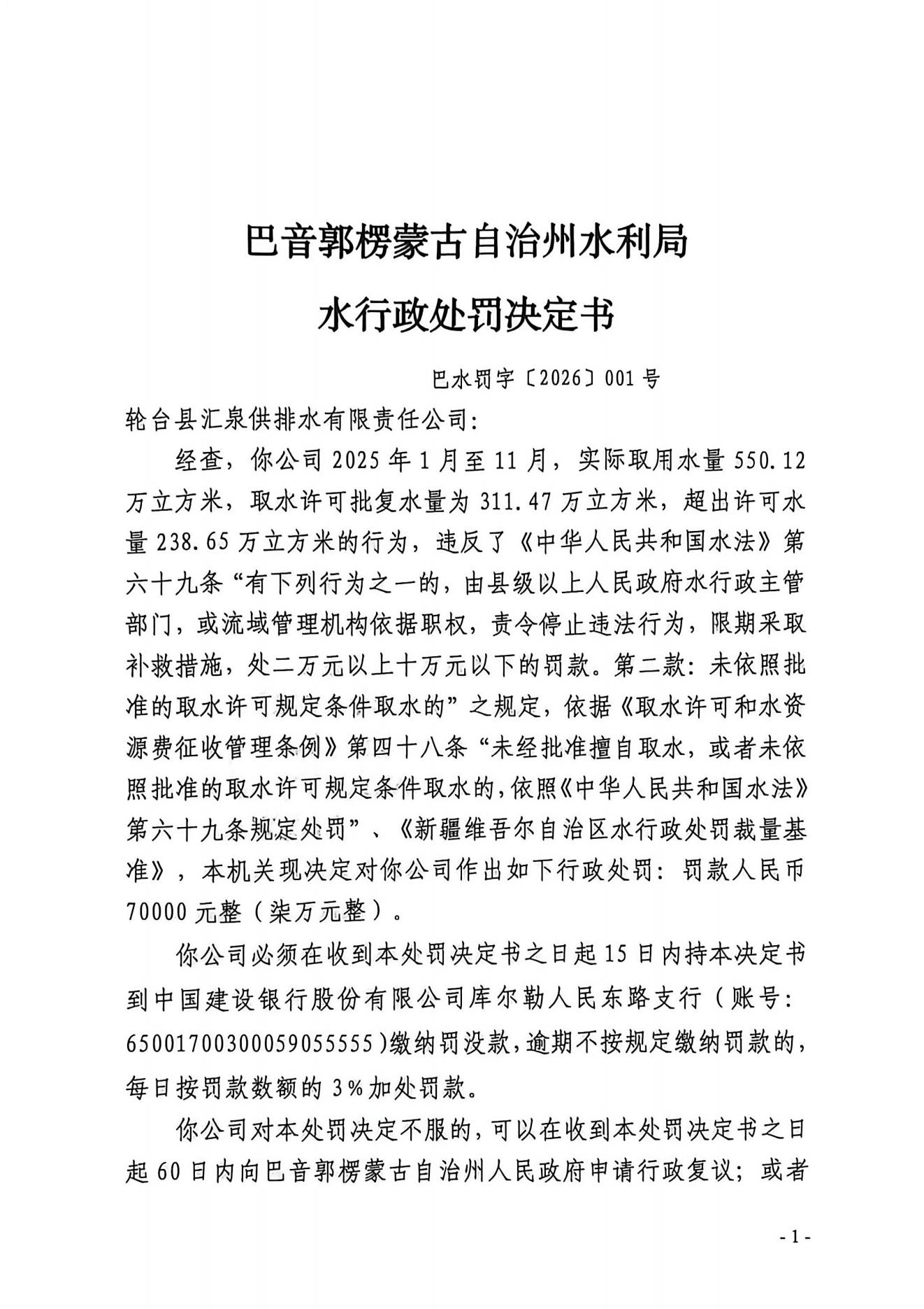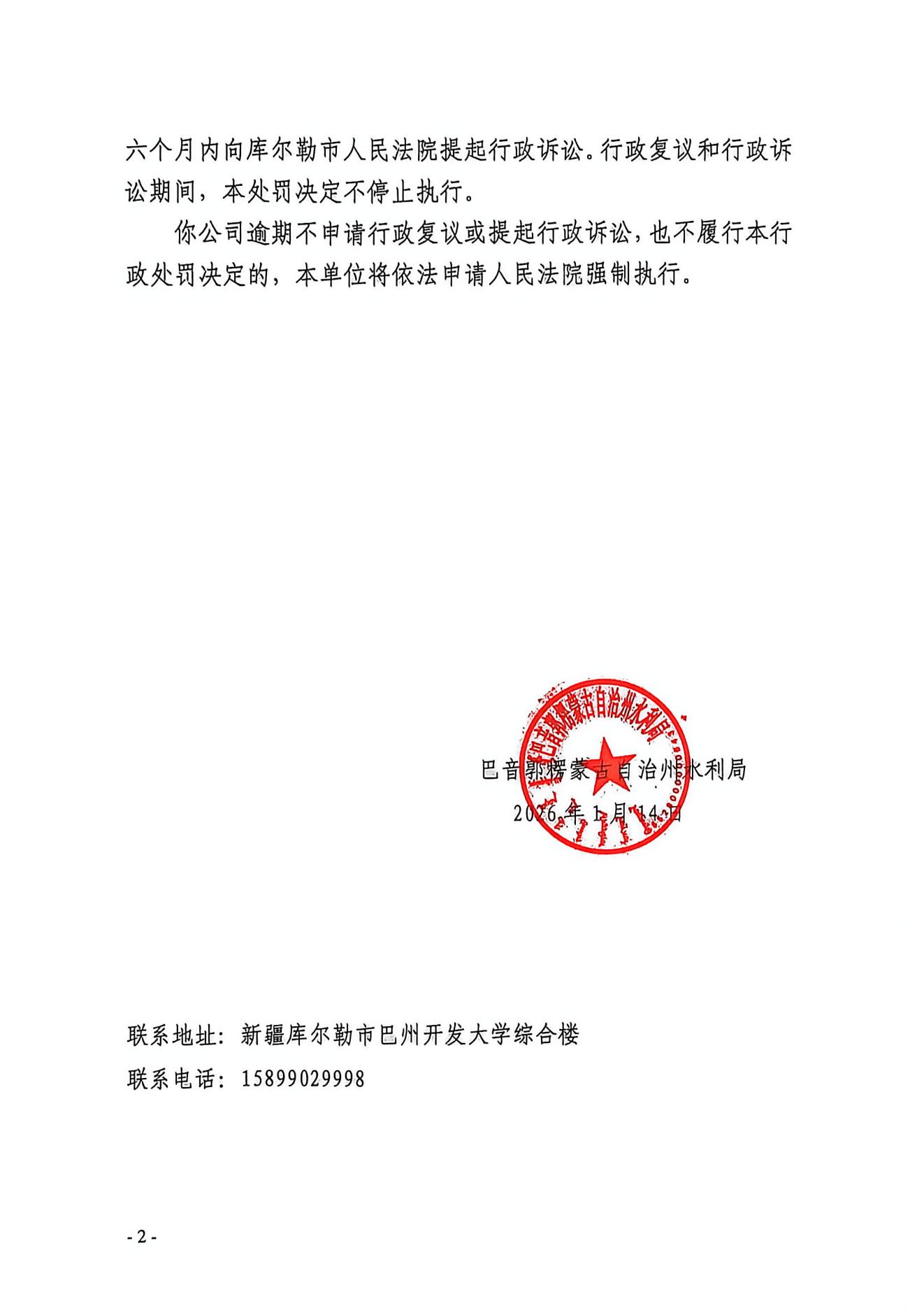 巴音郭楞蒙古自治州水行政处罚决定书