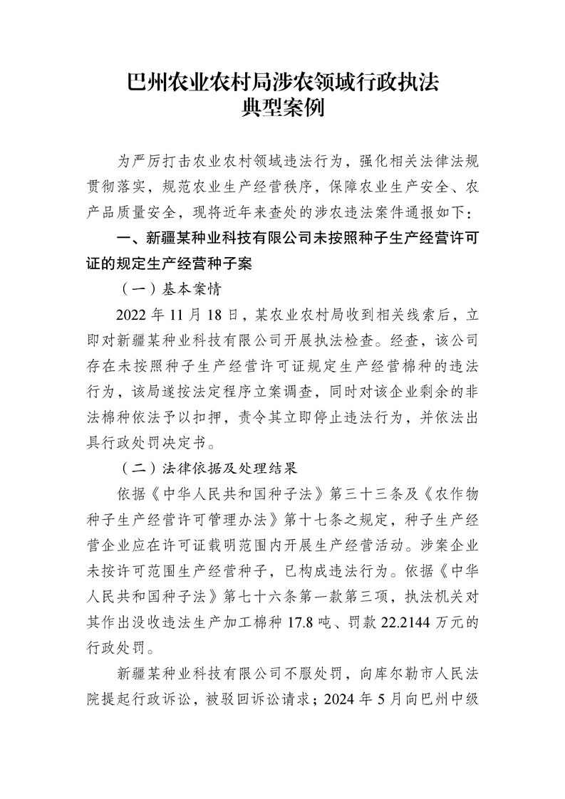 巴州农业农村局涉农领域行政执法典型案例