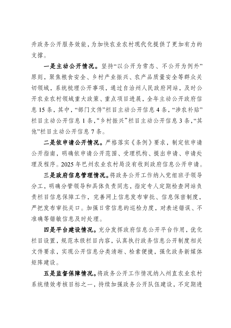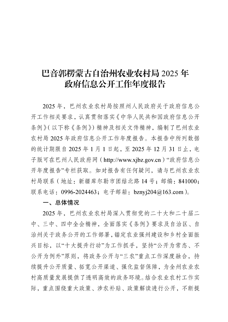 巴音郭楞蒙古自治州农业农村局2025年度政府信息公开工作年度报告