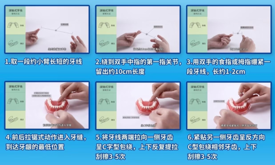✅正确做法:每天用1次牙线,将牙线弯成C形贴合牙面轻滑,牙缝较宽的人群,可搭配牙缝刷清洁。