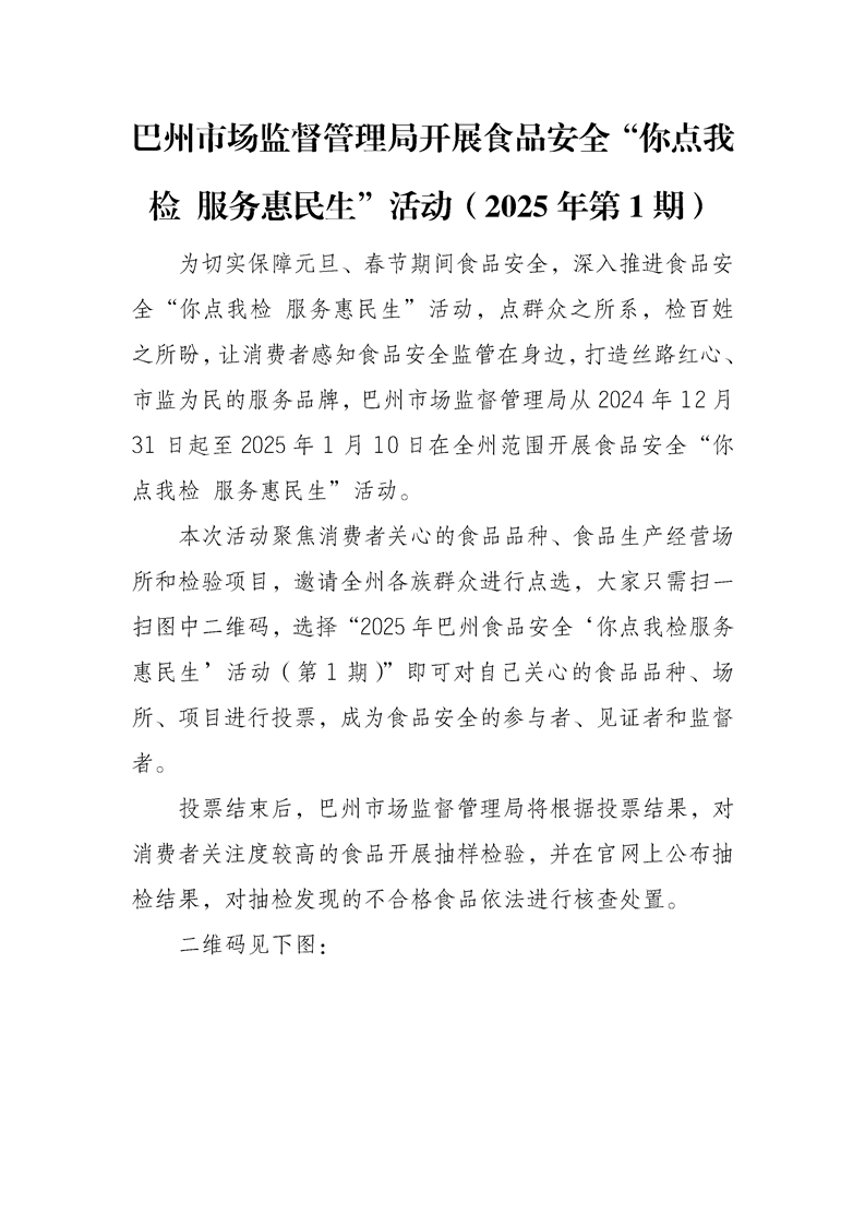 巴州市场监督管理局开展食品安全“你点我检 服务惠民生”活动(2025年第1期)
