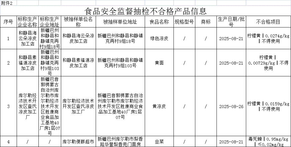 2、和静县素福源凉皮加工店制作经营的黄面,检出柠檬黄不符合食品安全国家标准规定;