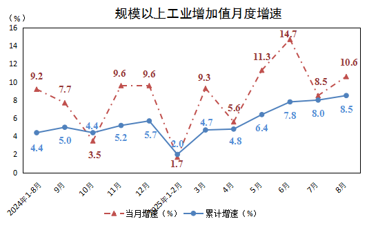 分三大门类看:采矿业、制造业、电力热力燃气及水生产和供应业增加值同比分别增长6.6%、11.7%、24.8%。