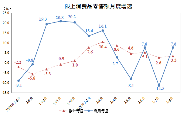 1-8月,全州实现限额以上社会消费品零售总额85.04亿元,同比增长3.3%,增速较1-7月提高0.7个百分点。