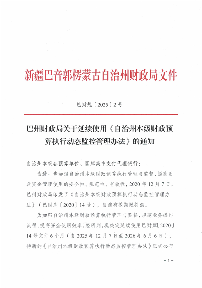 巴州财政局关于延续使用《自治州本级财政预算执行动态监控管理办法》的通知