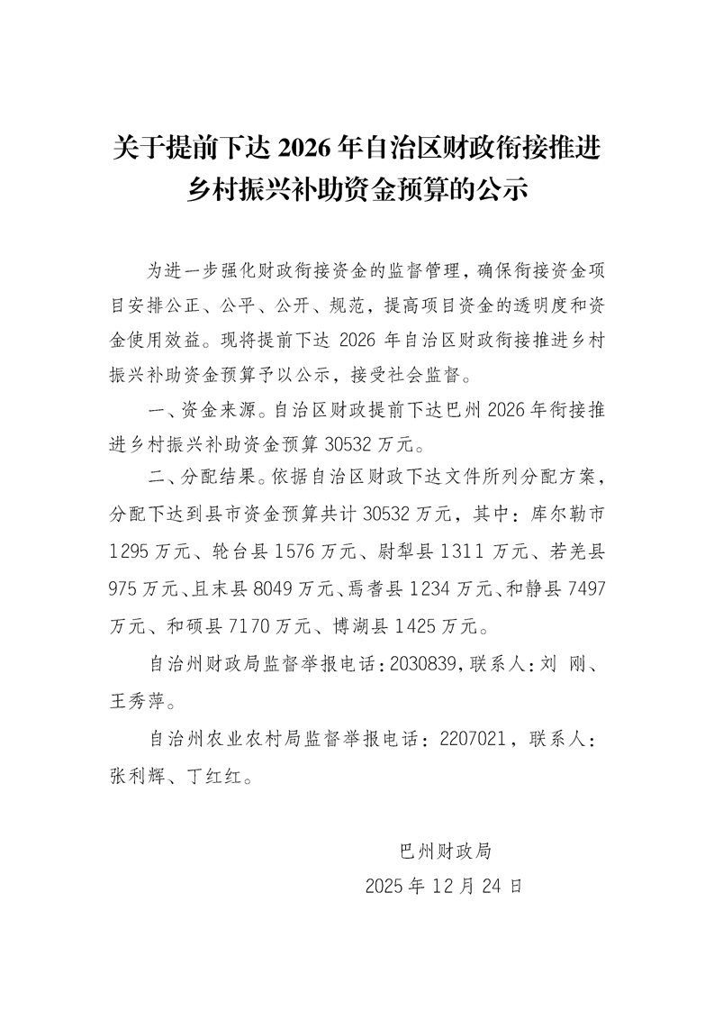 关于提前下达2026年自治区财政衔接推进乡村振兴补助资金预算的公示