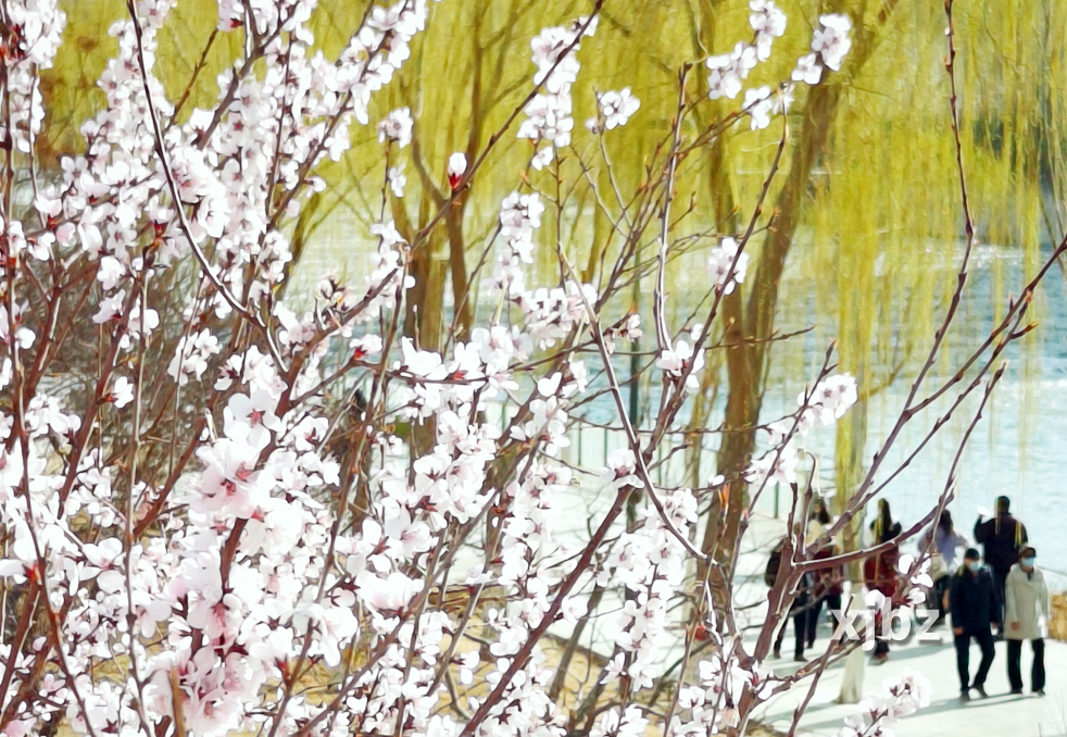 3月20日,春分时节,库尔勒春意盎然,景色如画。孔雀河畔,垂柳吐绿,桃花、杏花竞相绽放,市民漫步其间,感受明媚春光与城市活力。(记者 薛兵 摄)