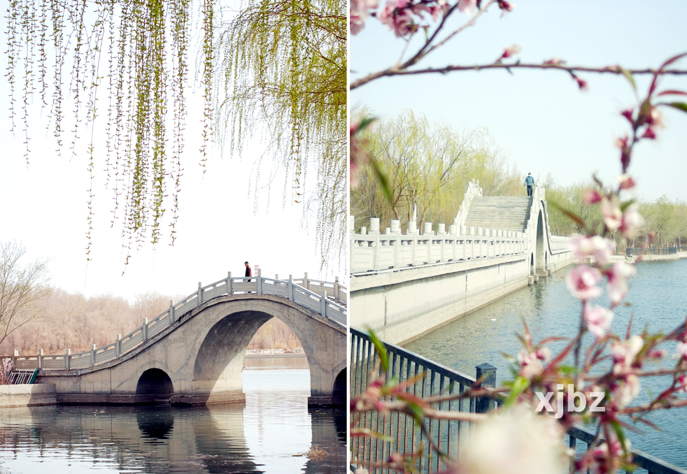 4月1日,库尔勒市杜鹃河生态湿地公园春意盎然。河畔杨柳吐绿,柔枝轻拂水面;榆叶梅竞相绽放,粉艳满枝;小桥流水相映,景致如画。市民漫步其间,踏青赏花,尽享梨城春日生态美景。(记者 薛兵 摄)