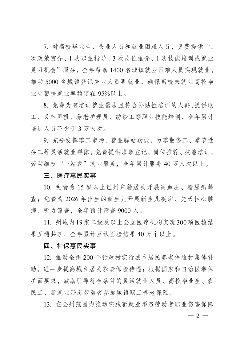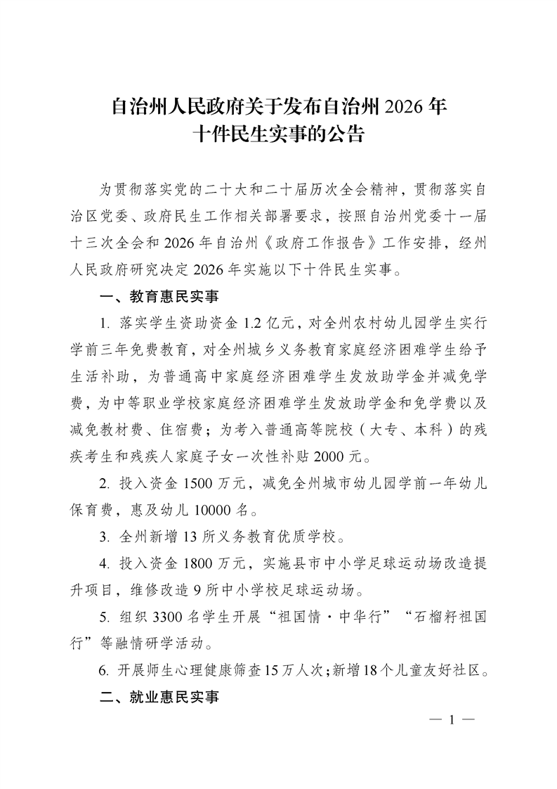 自治州人民政府关于发布自治州2026年十件民生实事的公告