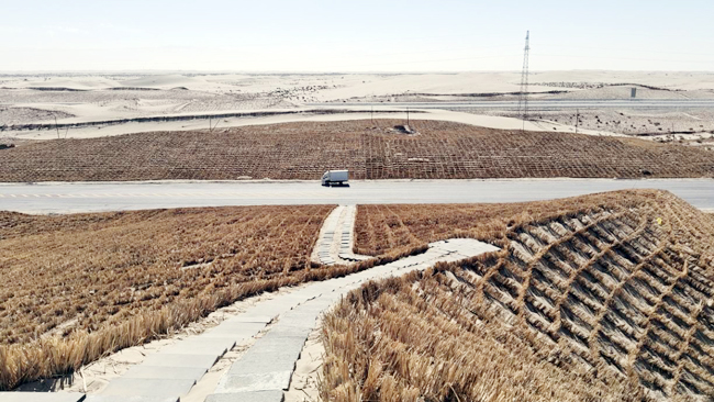 同时,且末县依托205万千瓦光伏治沙项目一比一配套治理的方式,在有条件的工程固沙范围内重叠实施生物治沙措施,用综合措施提升锁边成效。锁边工程项目负责人说:“此项工程在政府的大力支持下,我们严格按照施工方案和工程质量要求,确保工程经得起检验,为打赢塔克拉玛干沙漠边缘阻击战尽一份力量。”