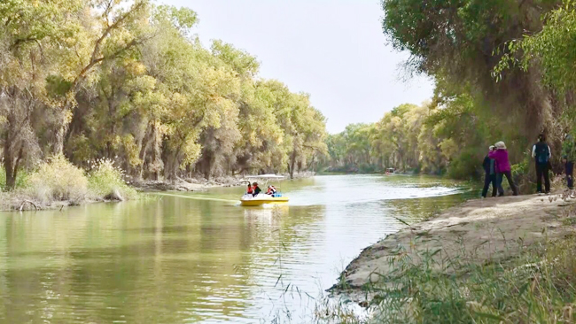 “今年特意在胡杨全黄前赶来,就是因为此时黄绿相间的景色有种油画的感觉。”河北游客赵磊乘坐游船在塔里木河上观赏胡杨后说。