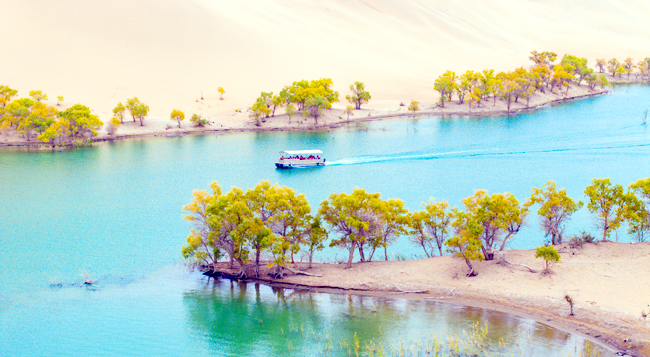 10月8日,尉犁县罗布湖风光旖旎,泛黄的胡杨、湛蓝的湖水、金色的沙丘,共同构成一幅山水画卷。游客乘船游览湖光山色,沉浸式感受沙漠湖泊呈现出的秋日美景。
