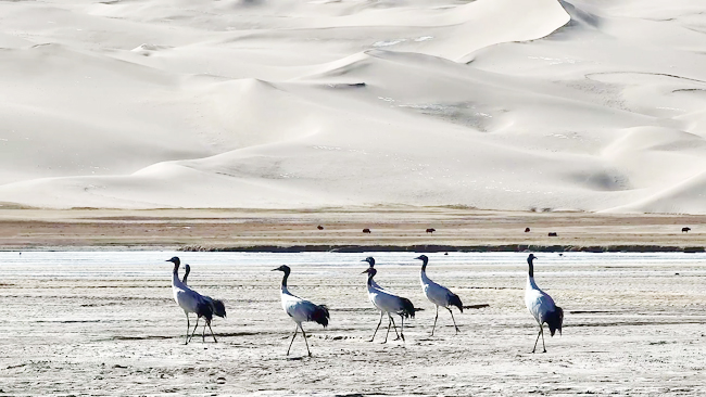 新疆阿尔金山国家级自然保护区是黑颈鹤在我国最北端的栖息地之一。近年来,随着保护区生态保护力度加大,依协克帕提湿地生态环境持续改善,不仅为黑颈鹤提供了充足的食物资源,也成为斑头雁、赤麻鸭等166种珍稀鸟类的理想栖息地。