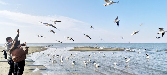 16日,来自云南的自驾游客王先生拿着馕块向空中抛撒,引得成群沙鸥围拢而来。“真没想到,在新疆的冬天能见到这么多水鸟!湖面壮阔、公路通畅,随手一拍都是美景。”王先生一边投喂一边感慨。他特意在沿途售卖处买了馕,沉浸式体验与水鸟互动的乐趣。