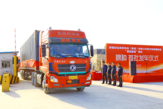 12月3日,巴州特色农产品首次以“公路口岸+属地直通”模式出口中亚国家。图为满载棉种的车辆驶出仓库。(记者 薛兵 摄)