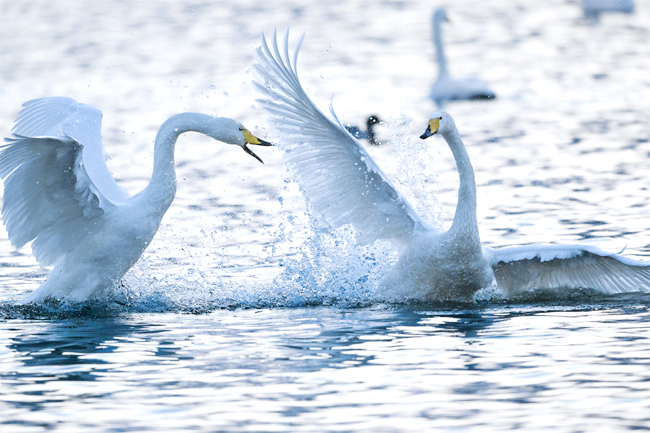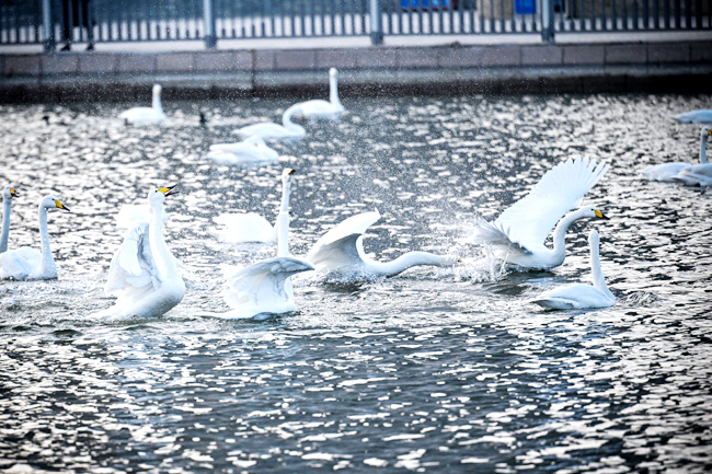 冬日的库尔勒杜鹃河澄澈的水面上,洁白的天鹅或舒展双翼,或追逐打闹,溅起层层浪花。(图片均由记者 陈飞 摄)