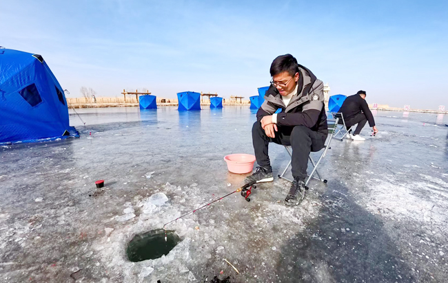 博斯腾湖莲海世界景区冰封湖面上,游客在进行冰钓。(通讯员 阿尔曼·热合曼 摄)