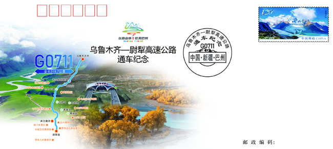 乌鲁木齐—尉犁高速公路通车纪念封正面。(图片由巴州邮政分公司提供)