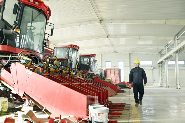 12月16日,库尔勒源丰农机有限公司厂房,一名工人从新型辣椒收获机旁走过。(记者 薛云少 摄)