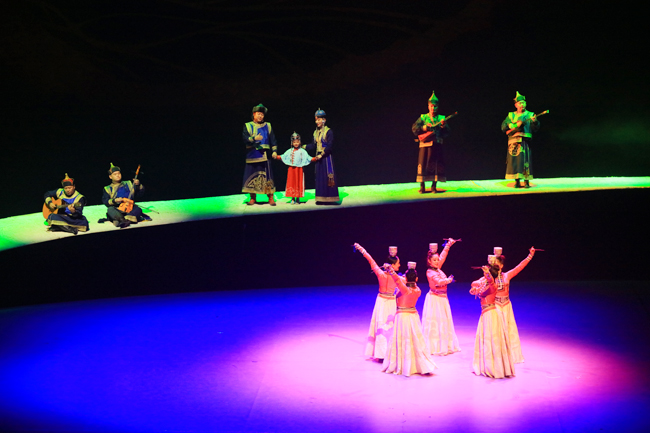 12月20日,原创歌舞诗《萨吾尔登》在巴州文化艺术中心上演。图为演出现场。(记者 薛兵 摄)