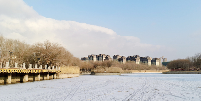 冬日的鸿雁河,是新区最动人的景致。河面完全封冻,冰层在阳光下泛着柔和的光泽,成为市民休闲的天然乐园,孩子们的阵阵欢笑声,打破了冬日的静谧。河岸边,成片的芦苇早已披上金黄色的盛装,苇穗在寒风中轻舞,偶有飞鸟掠过,为这幅冬日画卷增添了灵动生机。作为景观带核心地标的永安塔,巍然矗立在鸿雁河畔,塔身在蓝天的映衬下更显古朴庄重,是市民与游客打卡留影的首选之地。