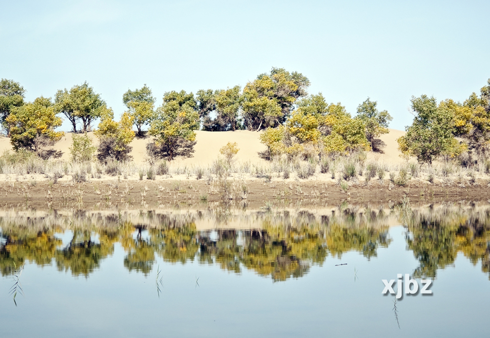 9月26日,在尉犁县罗布淖尔国家湿地公园,胡杨倒映水中美如画。(汪志鹏 摄)