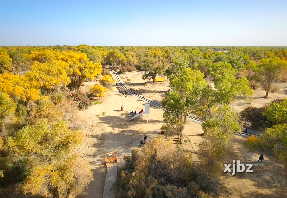 近日,游客在塔里木胡杨林公园内游玩。(薛兵 摄)