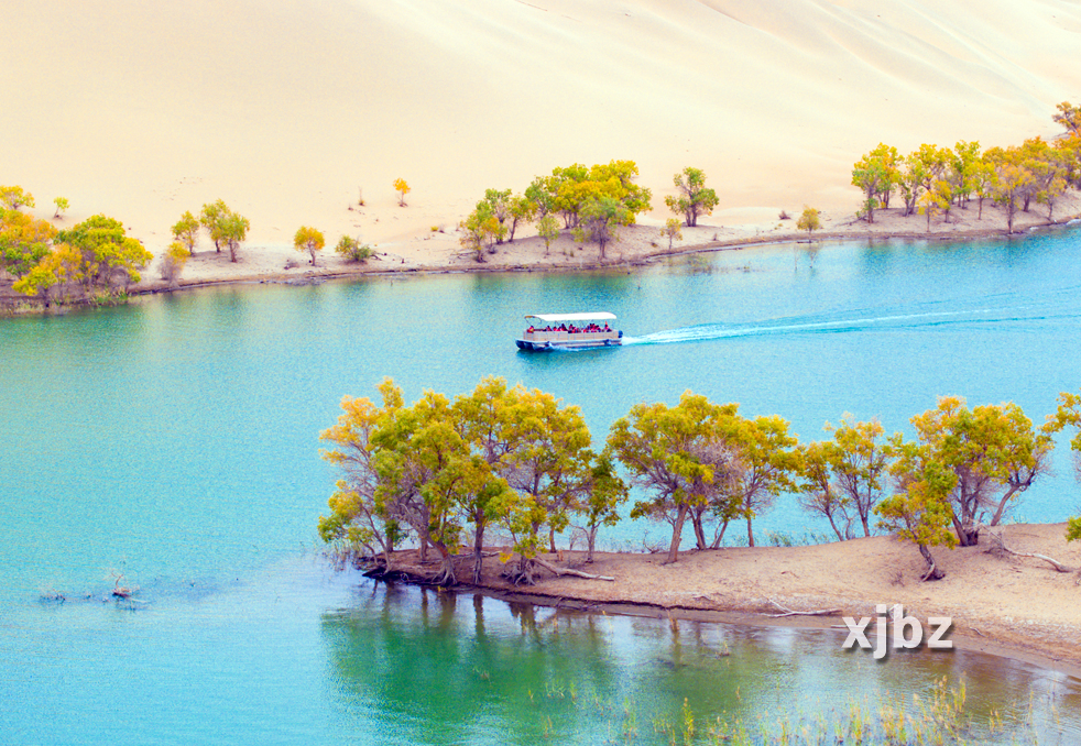 10月8日,尉犁县罗布湖风光旖旎,泛黄的胡杨、湛蓝的湖水、金色的沙丘,共同构成一幅山水画卷。游客乘船游览湖光山色,沉浸式感受沙漠湖泊呈现出的秋日美景。(汪志鹏 摄)