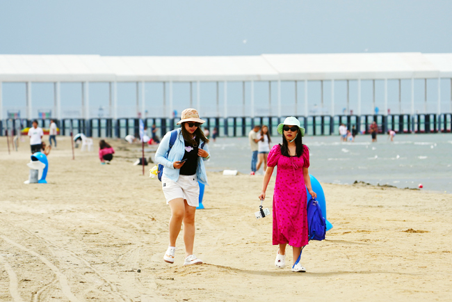 8月3日,和硕县金沙滩景区游人如织,来自全国各地的游客在这里休闲、纳凉、嬉戏。景区通过不断加大旅游基础设施投入和改进、提升服务质量,让越来越多的游客在这里尽享沙滩、湖水带来的无尽欢乐和别样风情。(记者 陈彦强 摄)
