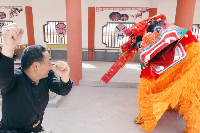 3月11日,若羌县吾塔木乡西塔提让村秦腔文化馆负责人李鹏举指导村民练习舞狮。(记者 邹焰忠 摄)