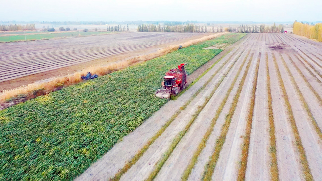 23日,四十里城子镇阿克墩村的千亩甜菜地里,一台甜菜收割机开足马力运转,叶片剥离、根茎挖掘、装车清运“一气呵成”。“往年采收要多台机器协作,今年一台一体机就能完成。”种植户佘勇军介绍,他今年种了1200亩甜菜,已与中粮焉耆糖厂签订订单,每吨收购价500元。目前采收进度达三分之一,亩产可达6至6.5吨,亩均毛收入3000至3500元。“糖厂提供全程技术服务,我们在地头看看就行,省心省力!”
