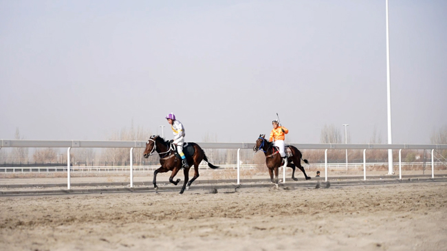 11月22日,2025和美乡村·伊犁马性能测试系列赛暨博湖县冬季民间赛马大会在博湖县西海龙马苑开赛。图为比赛现场。(通讯员 米尔扎提 摄)