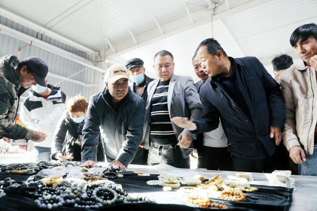游客在且末县玉石小镇选购且末玉石。(通讯员 阿斯耶姆·艾尼 摄)